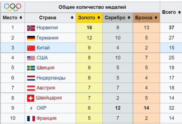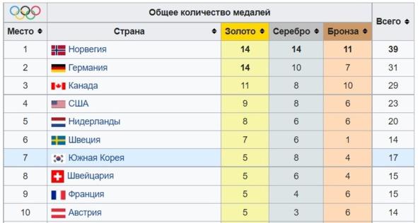 Итоговые таблицы ведущих стран на XXIII и XXIV зимних Олимпийских играх