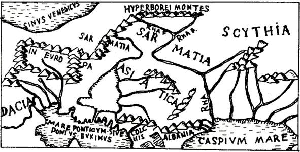 Для сравнения мы используем карту европейской части СССР19 и обнаружим, что на карте Птолемея есть такие вполне реальные географические объекты, как Балтийское, Черное, Азовское моря, а также Каспийское море с впадающей в него Волгой, названной древним авестийским именем RHA, отмечены все более или менее значительные возвышенности вплоть до Южного Урала, который отделен значительным расстоянием от намеченных Птолемеем на севере и протянувшихся в широтном направлений Гиперборейских гор, дающих начало двум истокам священной реки древних иранцев — Рахи. Уже эта карта свидетельствует о том, что Птолемей, а вероятно, и географы древности задолго до него различали Гиперборейские (или Рипейские) горы и Урал, и не ассоциировали их друг с другом.