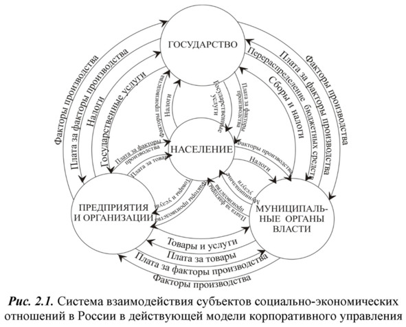 Вкладывая различные факторы производства в экономику, их владельцы ставят своей целью получение высокого уровня доходов в долгосрочной перспективе. Организация цивилизованного, правового взаимодействия субъектов социально-экономических отношений, как собственников на факторы производства, является весьма непростой задачей управляющей системы. Изменяя модель командно-административного управления на модель корпоративного управления, тем самым изменяется и сама система государственного и муниципального управления. Корпоративное управление рассматривается как система взаимовыгодного взаимодействия субъектов, обладающих правом собственности на факторы производства, объединяющая их в экономических процессах. Принятая в России в качестве базовой англо-американская модель корпоративного управления, принципиально изменила цели, задачи и полномочия органов государственной и муниципальной власти. Развитие модели корпоративного управления в России предполагает кардинальное изменение всех нормативно-правовых и организационно-административных документов, исключая с одной стороны, вмешательство административно-управленческих органов в экономические процессы, а с другой, направляя и организуя развитие экономики так, чтобы учитывались интересы всех сторон, связанных корпоративными отношениями. На микроуровне корпоративными отношениями объединяются следующие субъекты: акционеры, управляющие и исполнительные органы, структурные подразделения, поставщики, посредники и другие партнеры, обладающие факторами производства. На государственном уровне к субъектам корпоративных отношений относятся: домашние хозяйства (население), предприятия, организации, учреждения (бизнес), государства и муниципалитеты. Существующие между ними связи можно представить в виде рис.2.1.