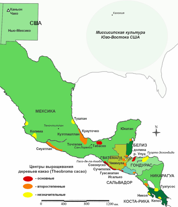 В землях майя зоны выращивания какао охватывали Тихоокеанское побережье, территорию современного мексиканского штата Табаско и Белиз. В колониальное время выращивание какао в Табаско и последующую торговлю им контролировали чонтали, а на территории южного Белиза значительное влияние имели майя-ица из последнего независимого государства Месоамерики.