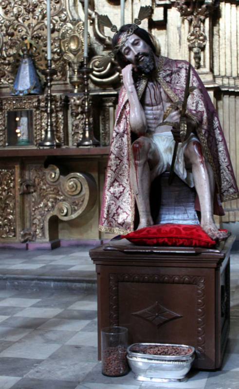 В Месоамерике какао применялось и в ритуальных целях, связанных, например, с рождением, свадьбой и смертью. У северных лакандонов, переселившихся в XVI веке в Чьяпас, в одном их самом важном ритуале yatoch k’uj («божий дом») использовалась церемония взбивания пены у какао. Занимались этим исключительно женщины — так у лакандонов прослеживается связь какао с женским началом[3]. Монах Томас Гейдж, который в первой половине XVII века проживал в Гватемале и Мексике, наблюдал ритуал подготовки индейцев к свадьбе. Принимавшим в нем участие специальным посредникам за услуги платили какао-бобами. В XVI веке Диего Гарсия де Паласио наблюдал за ритуалом наречения имени у майя, в котором какао было передано священником и матерью только что рождённому ребёнку. Епископ Диего де Ланда описывал колониальное «крещение», которое сопровождалось угощением смесью из какао, чистой воды и молотых цветков во время церемонии инициации. Фрай Бернардино де Саагун сообщал в XVI в. о том, как отцы наставляли идущих в религиозную школу детей совершить подношение напитка какаоатль богам. Примечательным в этом плане является поклонение так называемому «Христу-какао» — скульптуре Христа XVI века, которую до сих пор можно лицезреть у часовни кафедрального собора Мехико. Сам собор примыкал к главному ацтекскому храму — Великому храму, и когда индейцы посещали собор, то обязательно оставляли подношения в качестве подаяния у ног скульптуры Христа. Этим подношением были какао-бобы, а главными бенефициарами — священники кафедрального собора. Томас Гейдж отмечал богатство мексиканских монахов и частоту употребления ими шоколада. Да он и сам не прочь был воспользовался своей связью с религией для получения персональных благ. Когда Гейдж возвращался из Америки в Европу, то был весь увешан жемчужинами и драгоценными камнями, полагая, что это самый лучший и надёжный способ доставки богатства… Ещё до высадки на берег он был ограблен пиратами.