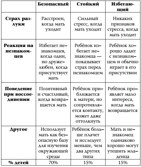 Исследователи выяснили, что отношения детей со значимыми взрослыми можно разбить на типы в зависимости от того, как первые реагируют на повседневные стрессовые ситуации. В итоге эти реакции сгруппировали на три отдельные категории: надёжный, ненадёжный тревожный и ненадёжный избегающий (или надёжный, тревожно-амбивалентный и избегающий).
