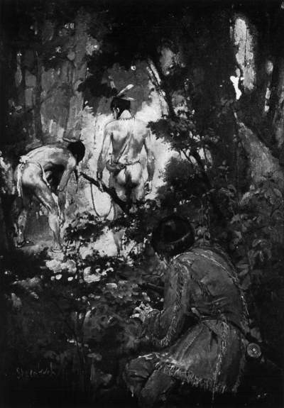 "He saw two warriors, and he lay in the bush while they passed only twenty yards away." [Page 214]