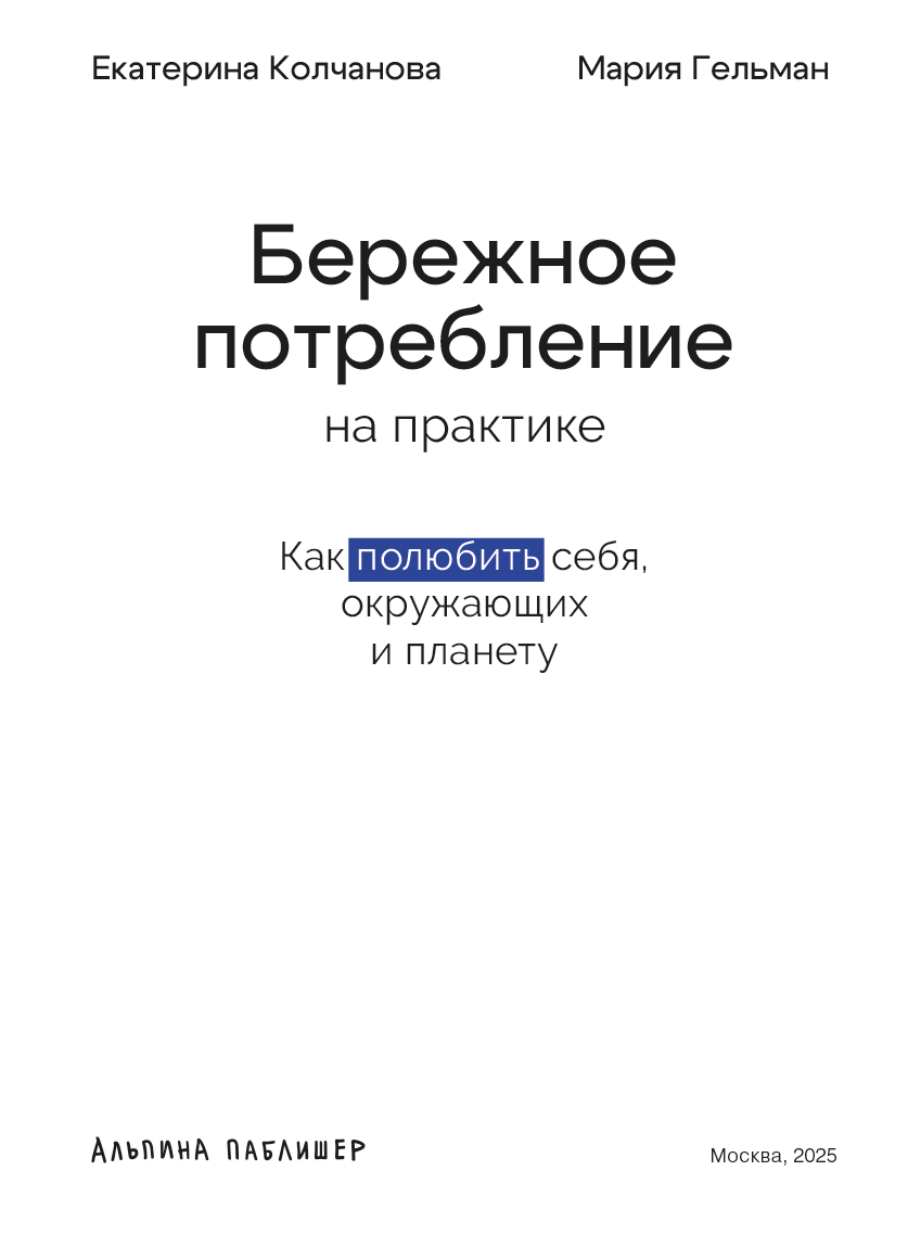 Книга эта написана одним человеком, но работали над ней целых две команды: бюро партнёрств для достижения целей устойчивого развития «Теперь так» [4] и издательство «Альпина Паблишер» [5]. Вопросы и идеи для контента помогали собирать читатели курса «Теперь так» и участники сообщества бережного потребления. Материалы о маркировках взяты из курса «Что всё это значит?», выпущенного «Теперь так» совместно с Экологическим союзом. Эксперты и экоблогеры дополнили книгу своими историями и комментариями. Над иллюстрациями работала команда иллюстраторов.
