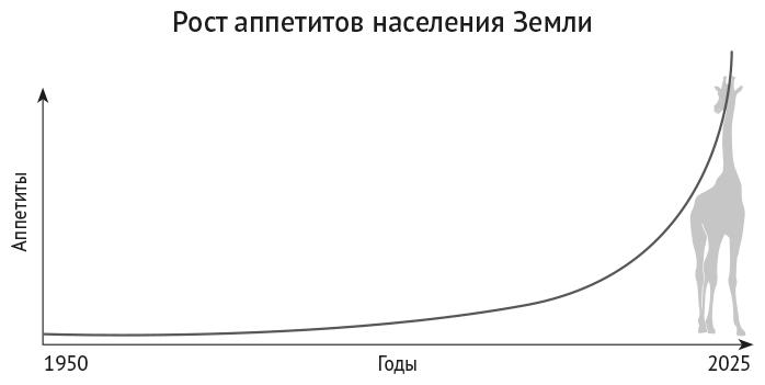 Вроде бы ничего особенного, но после Второй мировой войны население планеты утроилось. Каждому из 8 023 914 450 [7] живущих на Земле (на момент написания главы) нужно есть, пить, одеваться. Так получилось, что наши аппетиты стали стремительно расти, потребление природных ресурсов увеличилось уже не в три, а в десять раз [8]. Потребовалось в два раза больше земель, в пять раз больше воды и энергии и в четыре раза больше зерна. График происходящего выглядит так, как если бы удав из «Маленького принца» ещё не до конца переварил слона, но уже проглотил жирафа.