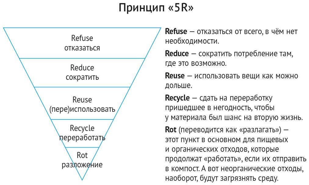 Принцип «5R» получил известность благодаря Беа Джонсон, наверное, самой известной в мире активистке, продвигающей стиль жизни «ноль отходов», автора блога и книги «Дом без отходов» [22]. Ей удалось сократить расходы семьи (она сама, её муж, сын и пёс) до 40% и отходы за год — до одной литровой банки мусора. Часть принципов «R» появилась ещё в 1980-х, во время одной из первых общественных кампаний, призывающих к сокращению отходов. Это были принципы reduсe («сократить»), reuse («переиспользовать») и recycle («переработать»). Книга Джонсон вышла в 2013 г., и концепция «5R» в ней была сформулирована в том виде, в каком мы её знаем сейчас, — перевёрнутый треугольник с пятью «R».
