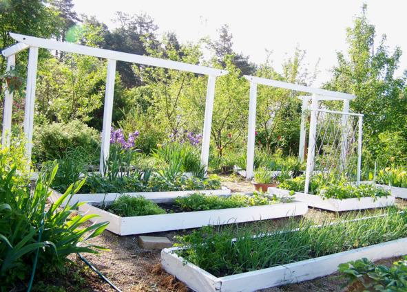 Несмотря на то, что огород может быть устроен с учетом декоративных качеств растений и отделочных материалов, его лучше располагать не на самом видном месте. Это может быть участок вблизи от бани, летней кухни или беседки с мангалом.