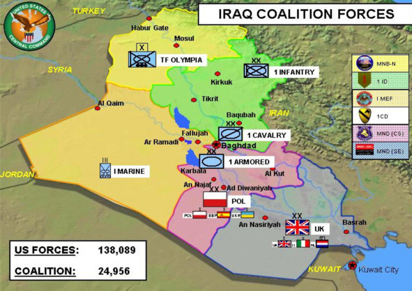 20 марта 2003 началась военная операция «Иракская свобода». Более 170 тыс. солдат США и коалиции вторглись в страну с целью «найти и обезвредить оружие массового поражения, остановить поддержку Саддамом терроризма и освободить народ Ирака». Через три недели солдаты коалиции начали штурм Багдада. 1 мая президент Буш в своем выступлении заявил «о завершении основных военных действий в Ираке». Однако успешное завершение блицкрига коалиции против регулярной армии Саддама означало лишь начало настоящего противостояния внутри страны. Разбив армию Саддама, одну из самых массовых в мире и крупнейшую в регионе, американцы понемногу начали привлекать другие страны к операциям стабилизации ситуации. В рамках так называемой «Коалиции доброй воли» десятки стран обеспечивали американцев логистической поддержкой, охраной военных и гражданских объектов.[4] В составе этой коалиции была и Украина. С 2003 года в Ираке действовали украинские миротворцы в составе 5-й отдельной механизированной бригады Вооруженных сил Украины численностью в 1690 военнослужащих. Украинские военные располагались на базе «Дельта» в городе Эль-Кут, что в 160 км. к югу от Багдада. В 2004 году участвовали в боях с шиитскими повстанцами из «Армии Махди». Тогда в ответ на призыв радикального шиитского проповедника Муктады ас-Садра бороться против иностранных оккупантов, по всему югу Ирака прокатилась волна восстаний арабов-шиитов.