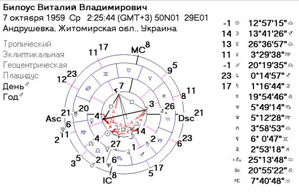 Отец клиентки Билоус Виталий Владимирович, родился 7 октября 1959 года в 2ч.25м.44с. (+3) в пос. Андрушевка Житомирской области, фермер, руководитель АО «Равнинное» Котельнического района Волгоградской области 20 сентября 2018 года был найден мертвым около лесополосы, у своей машины, с огнестрельным ранением. Умер с 18 на 19 сентября. Полиция закрыла дело с формулировкой «самоубийство». Дочь не верила, что отец ни с того, ни с сего мог покончить с собой, и пришла узнать, правда ли, что это было самоубийство. Я составила гороскоп на Виталия Владимировича и сразу же сказала, что никакого самоубийства не было, что он стал жертвой преступления.