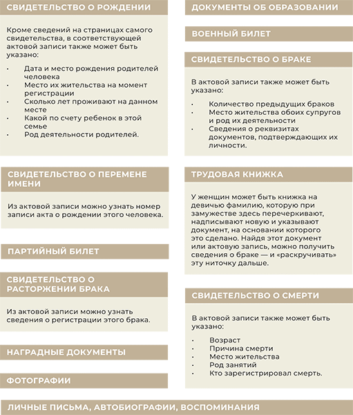 Некоторым личным документам, таким как свидетельство о рождении, соответствуют записи актов гражданского состояния, которые хранятся в архивах ЗАГС. Позже, заказав в ЗАГС справку о соответствующей записи, можно получить дополнительную информацию, которой нет в самом документе. Например, если все, что у вас есть по предку, – свидетельство о перемене имени, то из актовой записи об этом событии можно узнать номер записи акта о рождении. А оттуда уже получить сведения о родителях человека – и продолжить поиск.