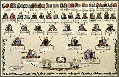В средневековье древо исполняли для знатных и царствующих родов. Дальше эту идею перехватили представители знатных родов. Так, прекрасным примером является родословное древо английских королей XV века. В нем предки лежат по типу Иессея, и буквально из их тел выходят деревья. Дальше идут короли уже XV–XVI веков, Ланкастеры и Тюдоры.