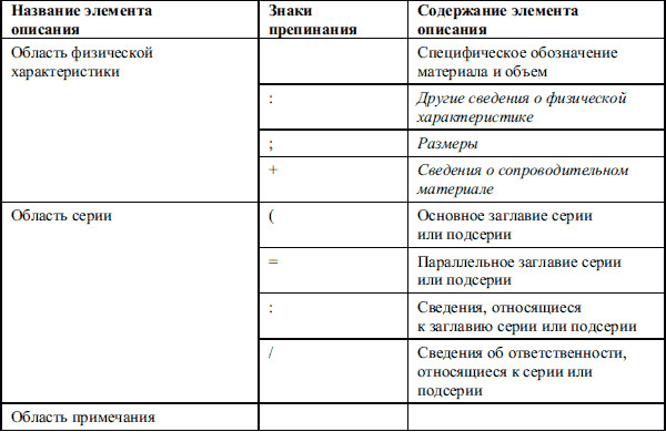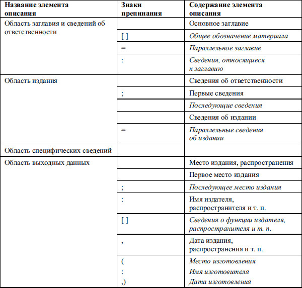 Области описания состоят из элементов, которые делятся на обязательные и факультативные. В описании могут быть только обязательные элементы либо обязательные и факультативные.