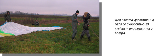 Когда все готово, лебедка начинает крутиться и тянуть вас вперед. Вы должны бежать за ней по полю (на деле бег получается, как в замедленной съемке) до тех пор, пока купол за вашей спиной не наполнится воздухом. В какой-то момент купол поднимется вверх и оторвет вас от земли. Это всегда происходит очень быстро и неожиданно. Только что вы бежали по земле — и вот уже пытаетесь бежать по небу, перебирая ногами в воздухе.