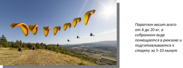 • Параплан весит максимум 20 килограммов — 10 кг подвесная система +10 кг само крыло.