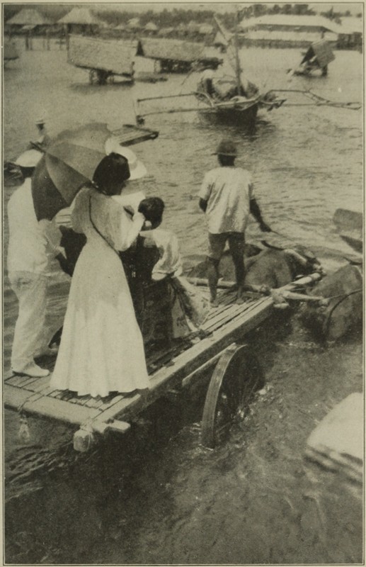 Our first landing place was at Kotta, on Luzon, where we started ashore in a small launch. It was a beautiful river of palms, but our boat got stuck in the mud and we were delayed. We finally reached the shore and were put into automobiles. Then it was that I began to feel as if I had joined a circus parade. Escorted by bands and soldiers, our motors moved slowly along the streets. Everywhere people lined the way, while the windows of the houses fairly dripped with heads.