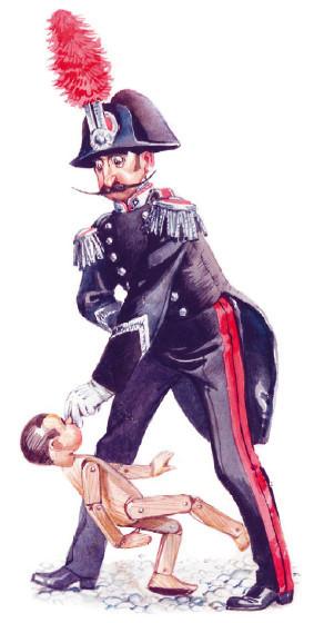 Пиноккио издалека заметил полицейского, перегородившего улицу, и попробовал перехитрить его, проскочив у него между ног.