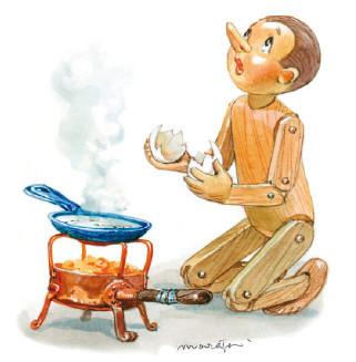 Пиноккио поспешно развёл огонь и поставил на него сковороду. Вместо масла он плеснул на дно воды, и, как только вода закипела, – крак! Он разбил яйцо, держа его над сковородкой. Но вместо желтка и белка оттуда выскочил маленький бойкий цыплёнок. Он поклонился Пиноккио и сказал: