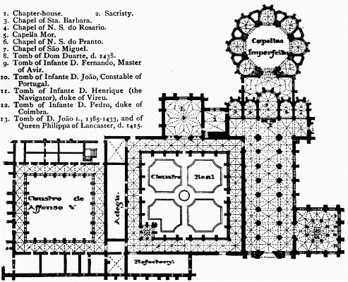 iii. cared more for the Church than for anything else—Decay begins—Later additions to Alcobaça—Batalha, Sta. Cruz—Thomar, Order of Christ reformed—Knights become regulars—Great additions, cloisters, dormitory, etc., by João de Castilho—His difficulties, letters to the King—His addition to Batalha—Builds Conceição at Thomar like Milagre, Santarem—Marvilla,
