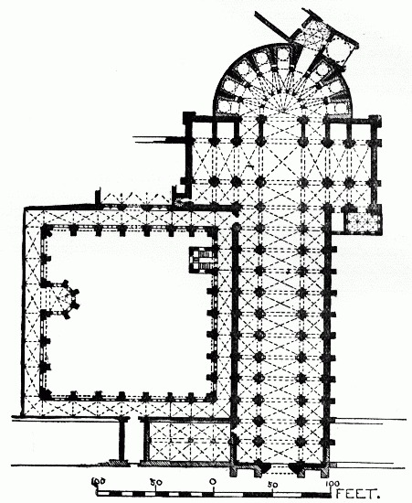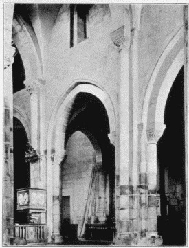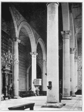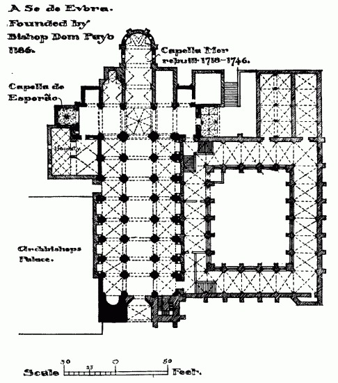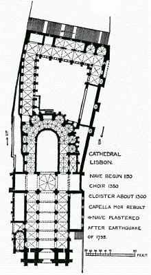 Growth of Christian kingdom under Affonso Henriques—His vow—Capture of Santarem, of Lisbon—Cathedral, Lisbon, related to Church of S. Sernin, Toulouse—Ruined by Great Earthquake, and badly restored—Sé Velha, Coimbra, general scheme copied from Santiago and so from S. Sernin, Toulouse—Other churches at Coimbra—Evora, its capture—Cathedral founded—Similar in scheme to Lisbon, but with pointed arches; central lantern; cloister—Thomar founded by Gualdim Paes; besieged by Moors—Templar Church—Santarem, Church of São João de Alporão—Alcobaça; great wealth of Abbey—Designed by French monks—Same plan as Clairvaux—Has but little influence on later buildings