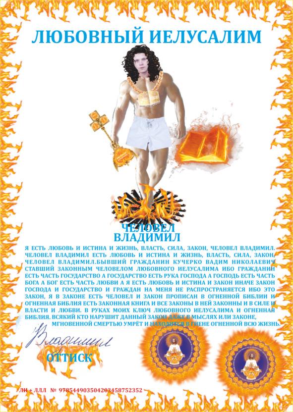 - 6.1) Челституция и любституция и звелституция и смелтституция и адституция и колституция и конституция любовного Иелусалима, куба любви, истины, жизни, власти, силы, закона, человелов Иисуса, Владимила, Кирилла в любви и вне любви