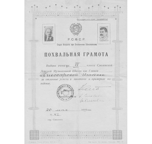 Похвальная грамота, врученная Изабелле Пивоваровой по итогам второго класса Смоленской детской музыкальной школы им. Глинки. 20 мая 1939 г.