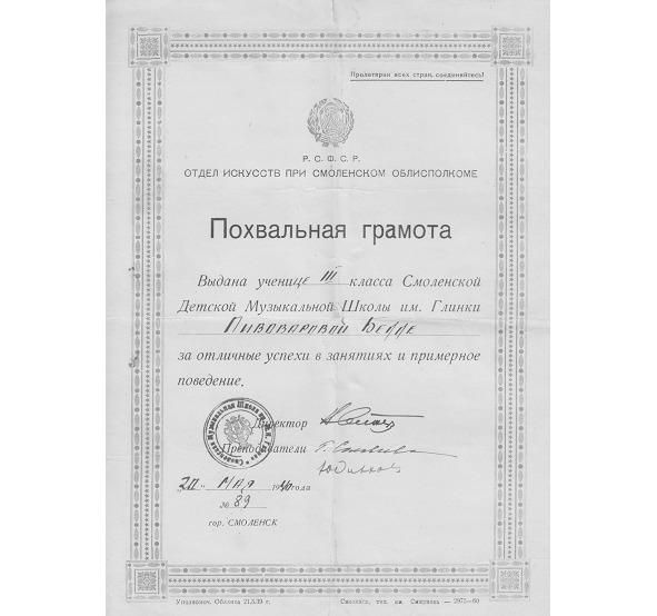 Похвальная грамота, врученная Белле Пивоваровой по итогам третьего класса Смоленской детской музыкальной школы им. Глинки. 20 мая 1940 г.