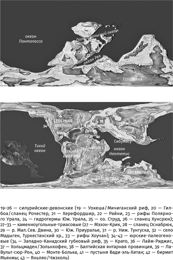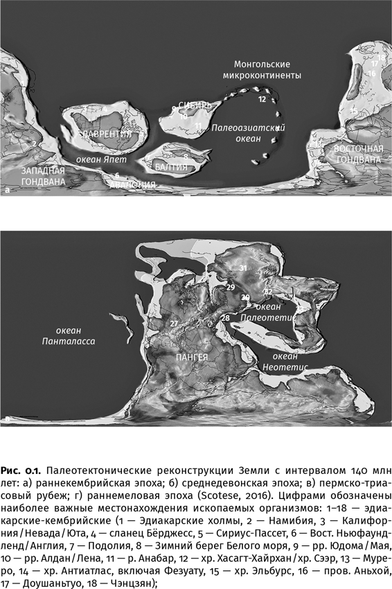 Палеогеографию тоже исключить трудно. Ведь когда читаешь, что кто-то жил 600 млн лет назад в Сибири, представляешь в первую очередь таежно-тундряную северо-восточную часть Азии, а отнюдь не изолированный тропический континент. Четыре сводные карты помогут разобраться, о каких конкретно землях (а по большей части — морях) идет речь: достаточно соотнести дату, указанную в тексте, с нужным временны́м срезом. На те же карты вынесены важнейшие местонахождения ископаемых: эдиакарские Зимний берег Белого моря и Нама; кембрийские Чэнцзян, Сириус-Пассет и сланец Бёрджесс; силурийский Херефордшир; девонские Райни и Хунсрюк; юрские Хольцмаден и Зольнхофен и некоторые другие. Это подлинные палеонтологические сокровищницы, откуда постоянно извлекаются на свет все новые и новые необычные существа, продолжающие переворачивать наши представления о прежних мирах (рис. 0.1).