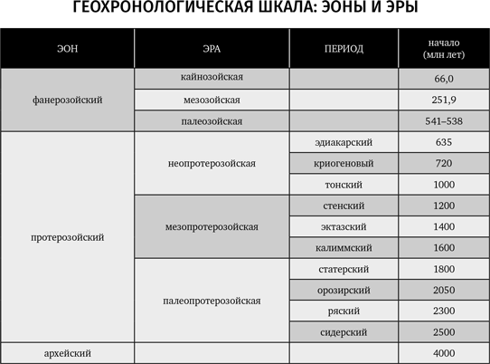 Без временны́х геохронологических подразделений тоже не обойтись, но международных названий геохронологических эр, периодов и иногда эпох для изложения событий совершенно достаточно. Да и эпохи вполне приемлемо разделять на раннюю-среднюю-позднюю. Обойдемся без современных «изысков» вроде терреновской или лопинской эпох, которые никому не нужны, в первую очередь — практикующим геологам и палеонтологам. (И в этих дисциплинах есть своя бюрократия, в том числе международная, творящая дело, необходимое исключительно для оправдания собственного существования.) Все важные временны́е подразделения вместе с датами приведены в таблице.