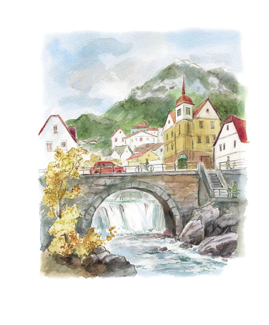 Второй достопримечательностью был водопад. С вершины горы стекало множество ручьёв и ручейков, они сливались в реку, и река текла в город. Кое-где она текла медленно и спокойно, а кое-где яростно бросалась со скал и уступов, встречавшихся ей на пути. Это и были водопады.