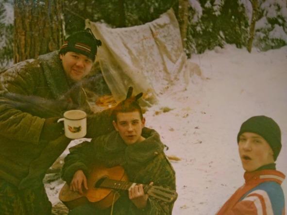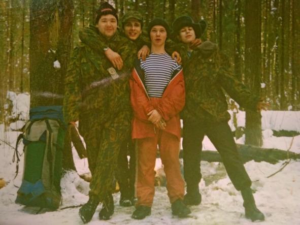 Вид у нашего коллектива был тот ещё: Сергейчик ходил в моём красном капроновом комбинезоне, (мне отдали его, когда закрыли нашу лыжную секцию), а поверх комбеза у него было драповое пальто. Надюха-Марина и в училище и в поход одевала балахон с Цоем, чёрные джинсы и модный китайский пухарь. Кабан ходил в армейском х/б, спортивной шапке, разгрузке и бушлате. Ноздря — в морских клешёных штанах, тельнике и брезентухе. Петрен — в клетчатой рубахе, вязанной шапочке и армейском х/б. «Гуляй-поле», — не более того и не менее того.