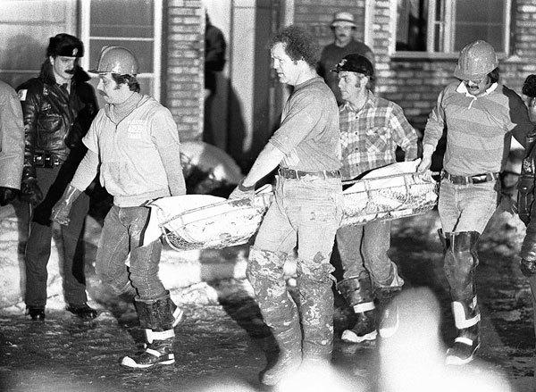 Полицейские и пожарные выносят останки одной из более чем двух десятков жертв, обнаруженных в погребе дома Джона Уэйна Гейси в местечке Норвуд-Парк в Дес-Плейнсе, штат Иллинойс.