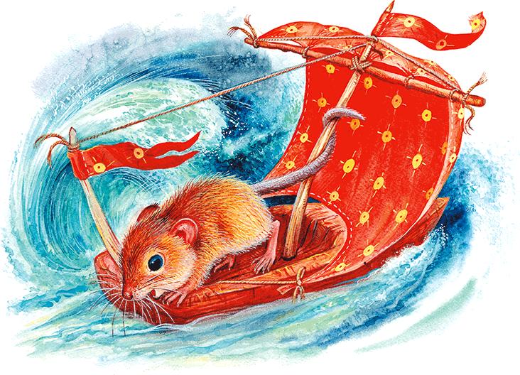 А мышонка несло да несло на лёгком сосновом кораблике. Ветер гнал судёнышко всё дальше от берега. Кругом плескались высокие волны. Река была широкая – целое море для крошечного Пика.