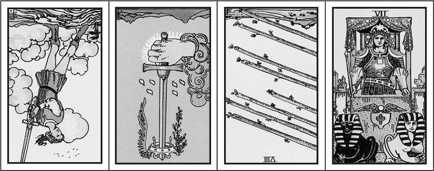 Символический осадок: перевернутый Паж Мечей, перевернутый Туз Мечей, перевернутая Восьмерка Жезлов и Колесница.
