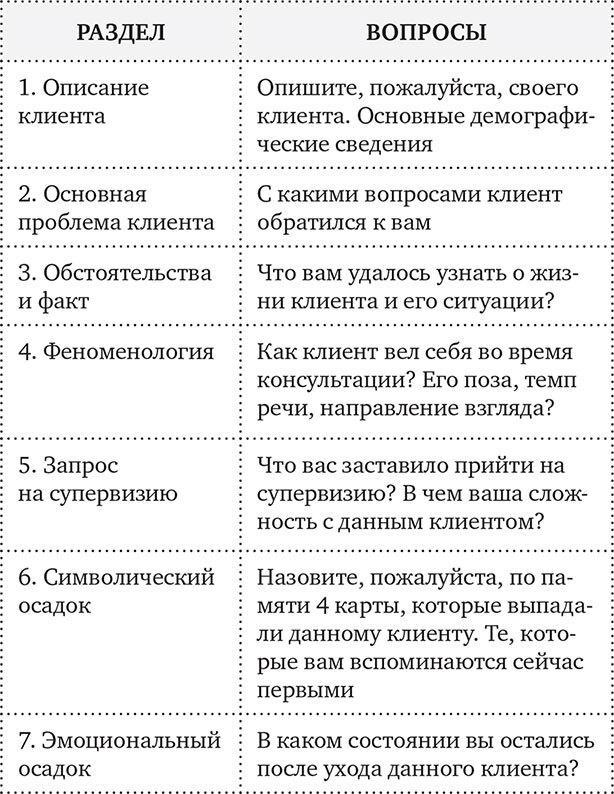Конечно, можно назвать и некоторые иные форматы супервизии. Для тарологов, на наш взгляд, перечисленные три формата являются наиболее ценными. В книге мы будем говорить преимущественно о третьем формате – процессуальной супервизии. Каждая глава будет посвящена одному практическому случаю. Конечно, в реальной супервизии никто не придерживается такой жесткой структуры презентации случая. Супервизанд говорит так, как чувствует, а супервизор проясняет с помощью вопросов неясные моменты. Однако есть ряд вопросов, которые задаются всегда, и согласно этим вопросам мы и будем представлять случаи в главах.