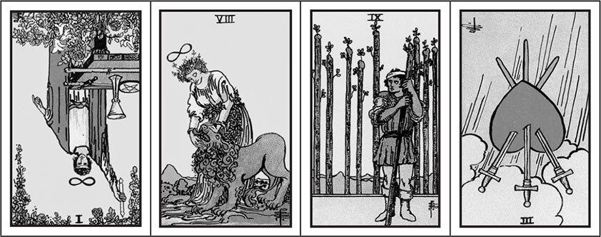 Символический осадок: перевернутый Маг, Сила, Девятка Жезлов и перевернутая Тройка Мечей.