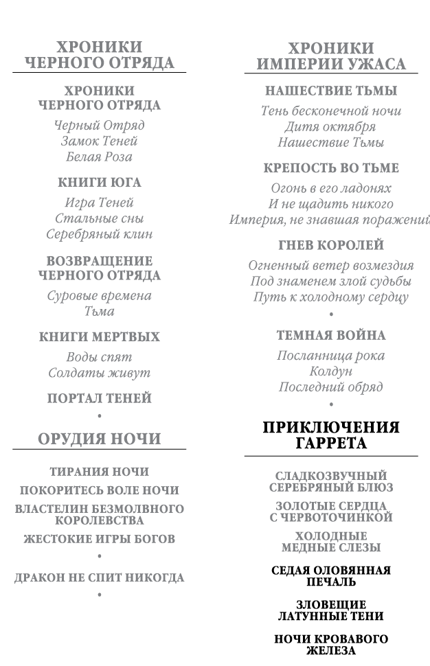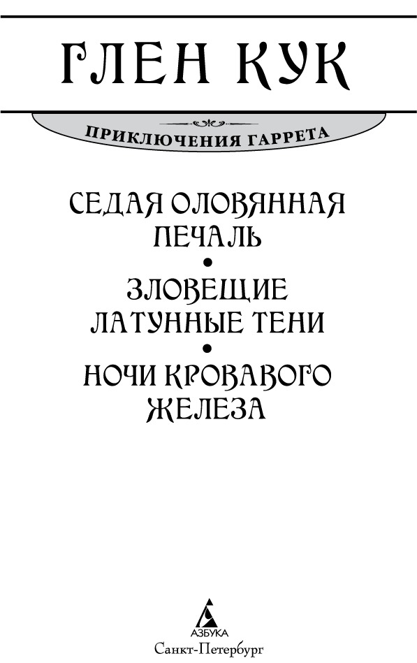 Седая оловянная печаль ; Зловещие латунные тени ; Ночи кровавого железа : романы / Глен Кук ; пер. с англ. Г. Косова, Н. Магнат, М. Сапрыкиной. — СПб. : Азбука, Азбука-Аттикус, 2021. — (Звезды новой фэнтези).