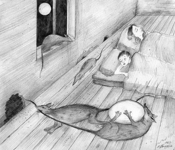 Среди ночи я был разбужен каким-то шебуршением и поскрёбыванием. Комната была залита мертвенным лунным светом, а по полу и по стоящему метрах в шести от нас столу сновали крысы.