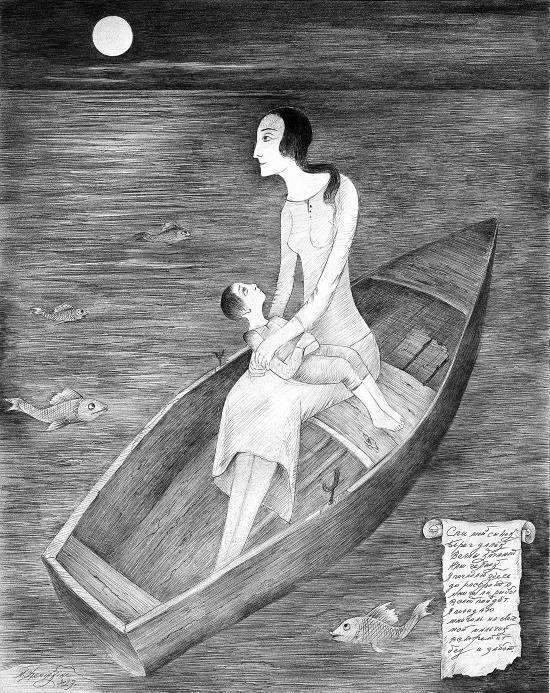 Живя в Америке, я напишу шестиметровый триптих, посвящённый трагической судьбе узников фашистских концлагерей, на котором будут изображены три громадных простреленных человеческих черепа на фоне кровавых надписей: “Бухенвальд, Дахау, Аушвиц”. Создам большую серию картин “Кёнигсбергские натюрморты” – с изуродованными войной черепами погибших солдат. Увеличу и отолью в бронзе для своего парка череп гидроцефала, на котором будет плясать и разыгрывать из себя ворона гениальный клоун Слава Полунин. Потом с моего согласия он сделает себе копию этого черепа в стеклопласте, приделает к нему с двух сторон колёса от старой телеги, присобачит деревянные оглобли, и мы будем поражать и восхищать венецианцев, раскатывая по площади Святого Марка во время венецианского карнавала. Слава в костюме Пульчинеллы потащит этот череп в сопровождении “лицедеев”, наряженных в костюмы по моим эскизам, с пьяным и талантливейшим Антоном Адасинским, изображающим Дьявола. Он будет возлежать в чёрном плаще на вершине черепа, играть на флейте и нести ахинею на выдуманном языке. А замыкать это бурлескное шествие, обозначенное Memento mori, будет пластичный и гибкий Анвар Либабов. На ходулях, в развевающихся чёрных лохмотьях, он будет изображать Ворона, которому и положено кружить над черепами.