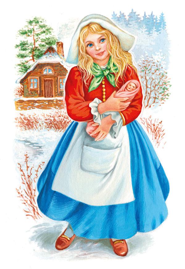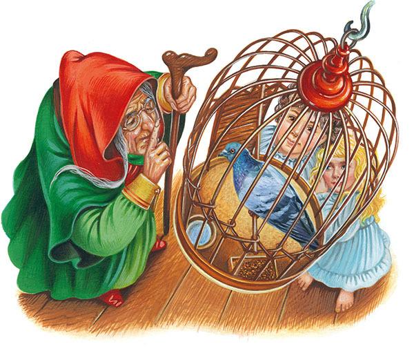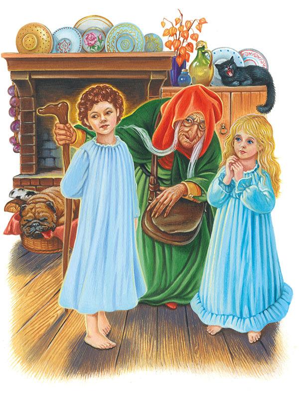 В комнату вошла маленькая старушка, одетая во всё зелёное, с красным капюшоном на голове. Горбатая, хромая и одноглазая, с длинным носом, достающим почти до подбородка, она шла, опираясь на клюку. Несомненно, это была волшебница. Она доковыляла до детей и обратилась к ним скрипучим голосом: