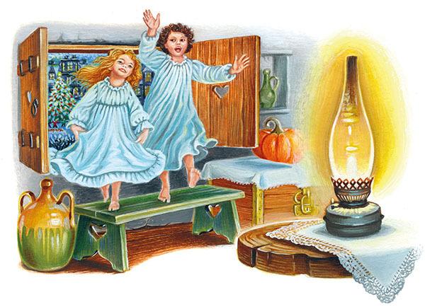 Сквозь ставни в дом проник яркий луч света, и лампа на столе зажглась сама собой. Тут дети проснулись, и, зевая, стали протирать глаза.