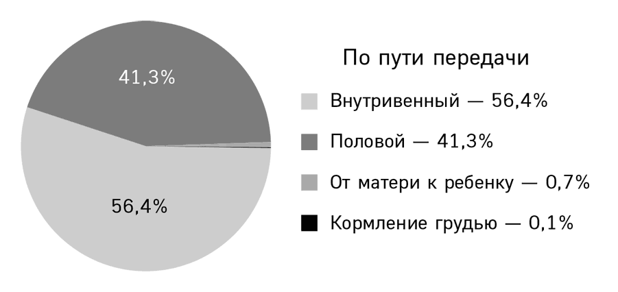 В 2018 году количество заразившихся ВИЧ[6] составляет 87,7 тысячи человек. Такие данные приводит Роспотребнадзор. По пу-ти передачи следующее распределение: