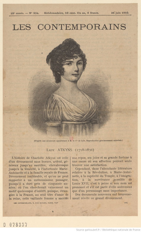 В это время в Лилле проживала леди Шарлотта Аткинс, в своем салоне она привечает юных офицеров роялистов, среди которых и Луи де Фротте. В прошлом, актриса королевского театра, её девичья фамилия Уолпол, вышедшая замуж за лорда Эдварда Аткинса, она вместе с мужем путешествовала по Франции. Потом она поедет в Париж и будет представлена Королеве знаменитой Жюли де Полиньяк, в салоне которой она блистала, и княгиней де Ламбаль (в одних книгах Шарлотта была представлена Королеве до Лилля, в других, после, это не столь важно). Затем супруги вернутся в Англию. В дальнейшем, она опять поедет в Париж, в апреле 1793 года, и попытается спасти Марию Антуанетту. Леди Аткинс хотела поменяться одеждой с Королевой и остаться вместо неё в камере, обрекая себя тем самым на неминуемую смерть, ей удалось путем подкупа проникнуть в темницу, но Королева отказалась бежать, не желая, что бы за неё пострадал кто-то другой. Потерпев неудачу, Шарлотта сосредотачивает все усилия, что бы устроить бегство малолетнего Людовика XVII, начиная с конца 1793 года вплоть до 8 июня 1795 года, официальной даты смерти Шарля Луи. На попытки спасения членов королевской семьи, она потратила все своё состояние.