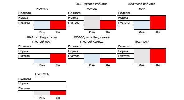 Холод и Жар могут быть пустым или полным и комбинироваться с ветром или сыростью. Полный жар — это наличие явного воспалительного процесса, пустой — воспаление с признаками Холода и Пустоты из-за снижения инь (структуры) органа.