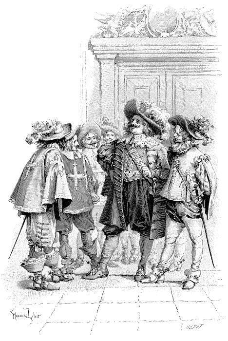 – Ах, боже мой, самым простым и естественным образом. Трое из лучших моих солдат, имена которых известны вашему величеству и преданностью которых вы изволили неоднократно быть довольны и которые, могу уверить ваше величество, весьма усердны в службе, трое лучших солдат моих, господа Атос, Портос и Арамис, отправились прогуляться с молодым гасконским дворянином, которого я им отрекомендовал вчера утром. Прогулка эта должна была состояться в Сен-Жермене, кажется. Они условились встретиться у Кармелиток, как вдруг там же появились господа де Жюссак, Каюзак, Бикара и ещё два гвардейца, которые пришли туда такой многочисленной компанией, очевидно, не без дурного умысла нарушить существующий указ.