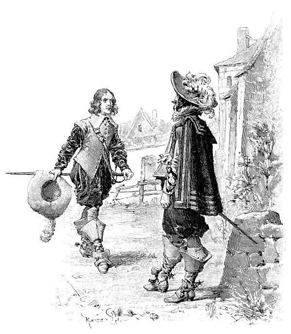 – Мы будем иметь честь напасть на вас, – отвечал Арамис, приподняв шляпу одной рукой и вынув шпагу другой.