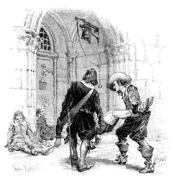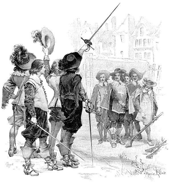 В те времена подобный переполох был делом обыкновенным, и редкий день проходил без того, чтобы тот или другой город не вносил в свою летопись подобного события. То враждовали между собою знатные господа; то король воевал с кардиналом; то испанцы воевали с королём. Помимо этих войн, неизвестных или известных, скрытых или явных, были ещё воры, нищие, гугеноты, бродяги и слуги, воевавшие с целым светом. Горожане вооружались против воров, бродяг и слуг; часто против знатных вельмож и гугенотов; иногда против короля; но против кардинала и испанцев – никогда. Подобная привычка привела к тому, что в вышеназванный первый понедельник апреля месяца 1625 года горожане, услышав шум и не видя ни жёлтых с красным значков, ни ливрей слуг герцога Ришелье, бросились к трактиру «Вольный мельник».