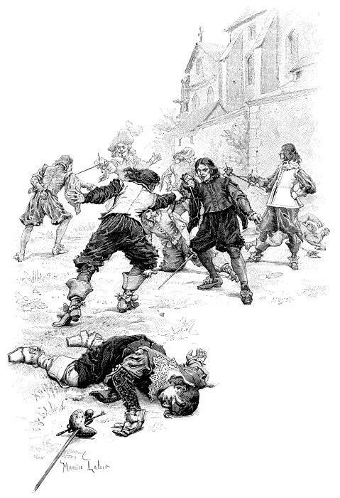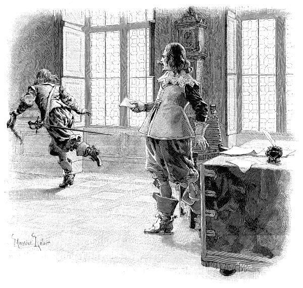 Арамис уже поразил одного противника, но другой сильно теснил его. И всё же Арамис был ещё в хорошем положении и мог защищаться.