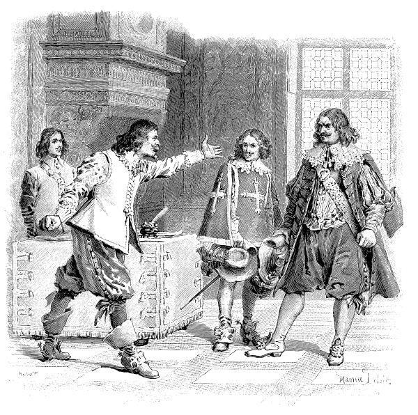 Д’Артаньян рассказывает, что, явившись впервые к капитану королевских мушкетёров де Тревилю, он встретил в его приёмной трёх молодых людей, служивших в том же знаменитом полку, куда и сам он мечтал быть зачисленным, и что звали их Атосом, Портосом и Арамисом.