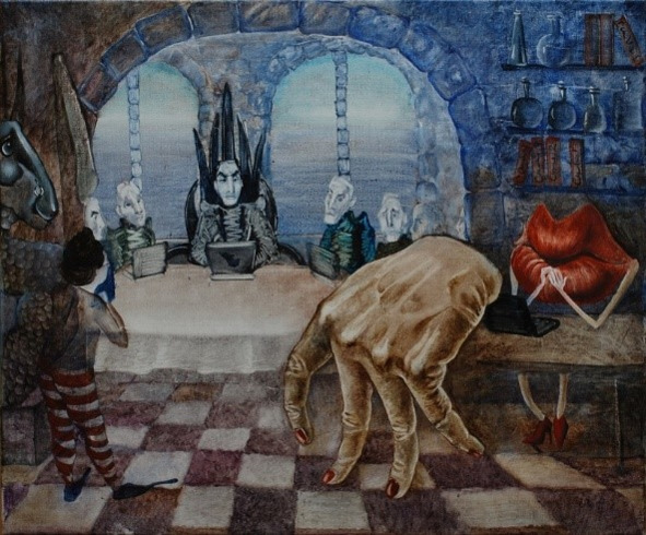 Крикуль узнал голос Отца, но пока не мог разглядеть его самого. Рука продвинулась вперед, и перед Крикулем предстало зрелище, от которого тут же перехватило дыхание. Вокруг стола, занимавшего всю середину овального кабинета, сидел не один, а двенадцать Страхов. Все они были на одно лицо, и Крикуль сейчас не смог бы с уверенностью определить, кто же из них Отец. Двенадцать пар глаз устремились, как показалось Крикулю, прямо на него. Крикуль забился в угол у самого выхода, рядом с каменным изваянием Химеры, и замер.