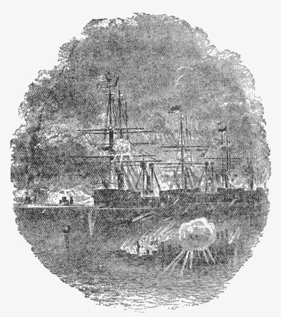 "While preparations were being made to destroy the ship, the sick and wounded were lowered into boats and conveyed ashore, while the men at the starboard battery continued to fight in splendid style, firing at every flash of the enemy's guns. The small arms were thrown overboard, and all possible damage was done to the engine and everything else that might prove of use to the enemy.